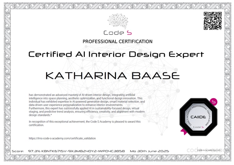 Ich bin Katharina Baase, Innenarchitektin (Dipl.-Ing. FH) und zertifizierte Expertin für Künstliche Intelligenz in der Architektur und im Interior Design. Mit meinem interdisziplinären Hintergrund – bestehend aus Architektur, Gestaltung, Visualisierung und KI – begleite ich Architekt:innen, Planer:innen und Designteams dabei, neue Technologien produktiv, kreativ und nachhaltig in ihre Projekte zu integrieren.